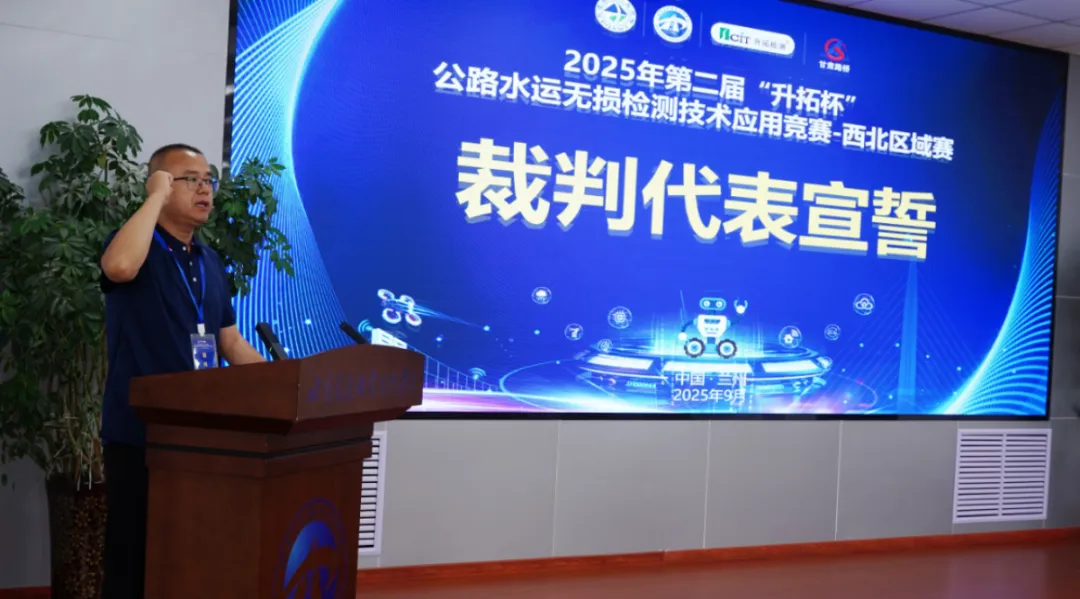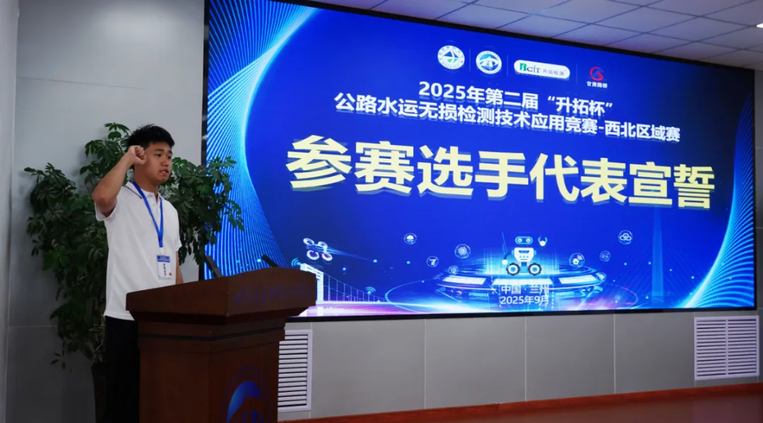 王鸿儒代表全体参赛选手宣誓。在2025年第二届升拓杯公路水运无损检测技术应用竞赛西北区域赛中,严格遵守比赛的各项规则,认真对待来之不易的参赛机会,服从裁判,尊重对手,用自己最佳的表现、最好的成绩,充分展现交通运输行业从业者的技能水平和精神风貌。