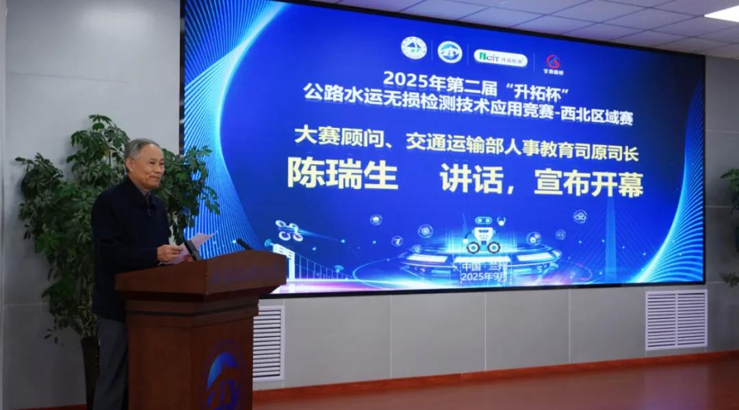 最后,大赛顾问、交通运输部人事教育司原司长陈瑞生讲话。他代表竞赛组委会秘书处,对竞赛顺利开幕表示热烈祝贺,向远道而来的各参赛队伍和选手致以诚挚敬意!他表示本届竞赛是深入贯彻习近平总书记关于做好技能人才工作重要指示精神的具体实践,也是落实交通强国战略、加强高技能人才培养的重要举措。通过搭建技术交流与技能展示平台,竞赛将有力促进行业技术进步和人才成长,为高质量发展提供坚实人才保障。并宣布2025年“升拓杯”公路水运无损检测技术应用竞赛—西北区域赛开赛。预祝第二届“升拓杯”西北区域竞赛圆满成功,祝所有选手赛出水平,载誉而归。
