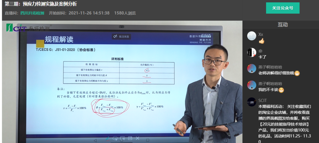 11月26日,2021年工程无损检测及智慧检测(监测)线上交流会(第三期)预应力检测实施及案例分析圆满结束,吸引了近4000人次行业技术人员在线观看,并积极参与互动讨论。